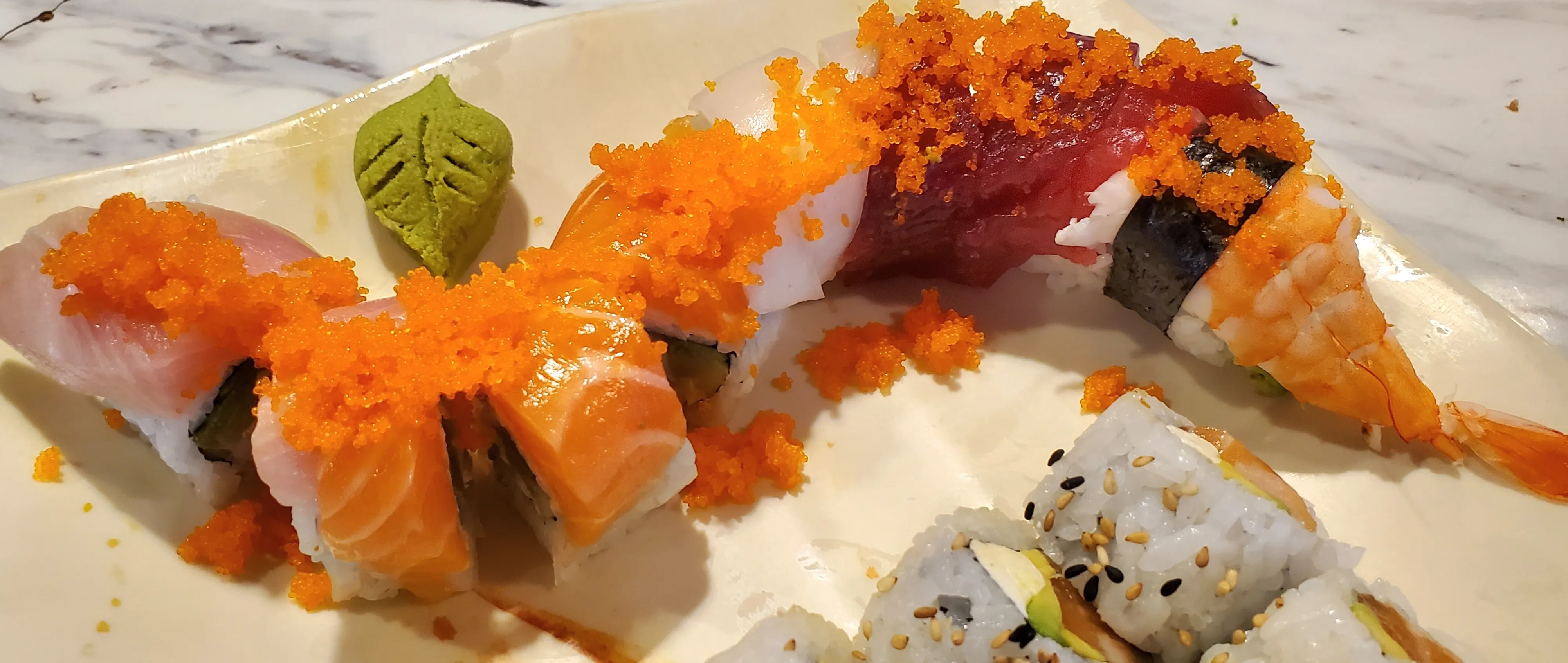 1 tempura shrimp roll, 1 krab roll, 1 California roll & 1 piece each of tuna, yellowtail, salmon, albacore, escolar, mixed scallops, butterflied shrimp, octopus, krab stick & sea eel (2 pcs) nigi....