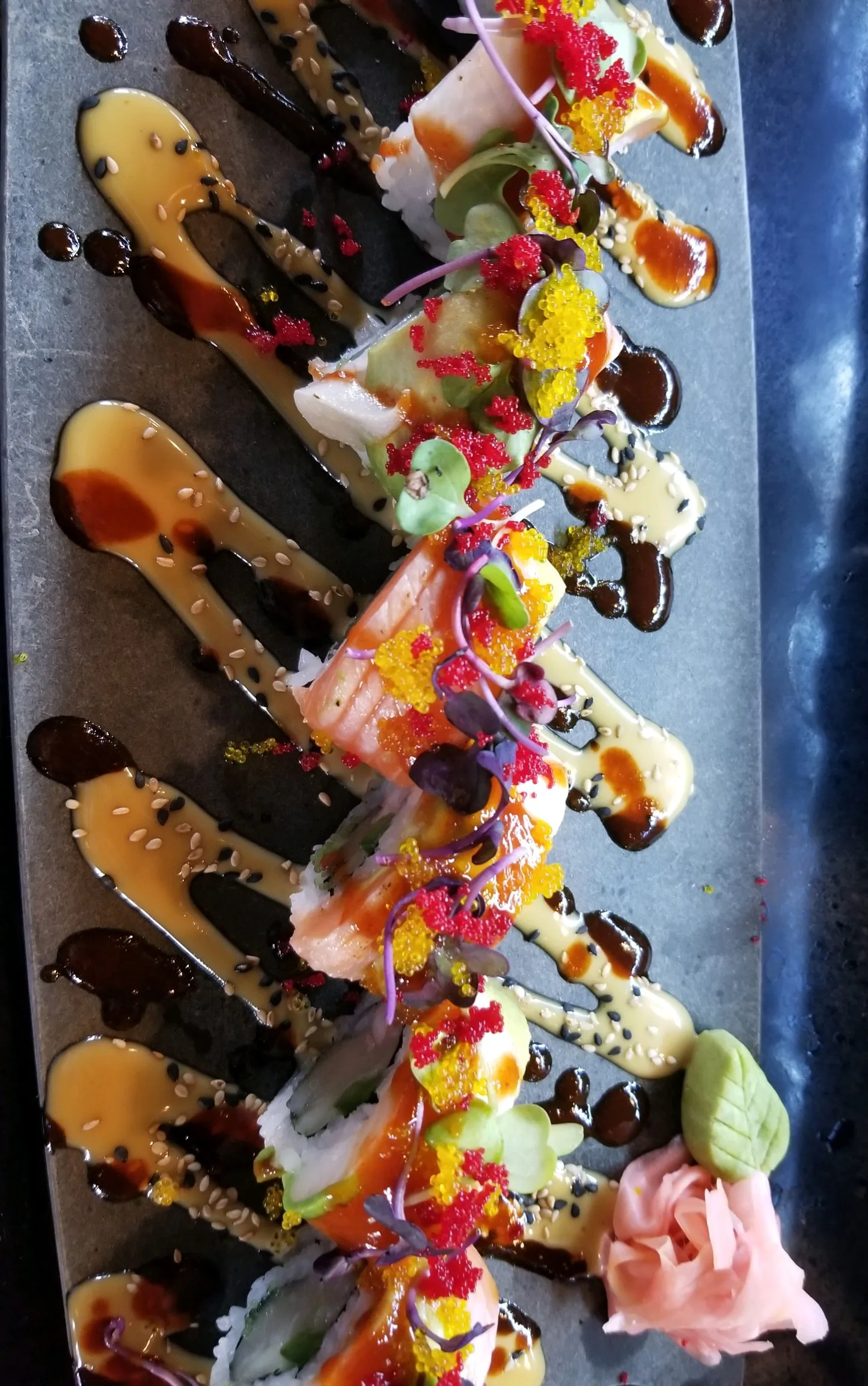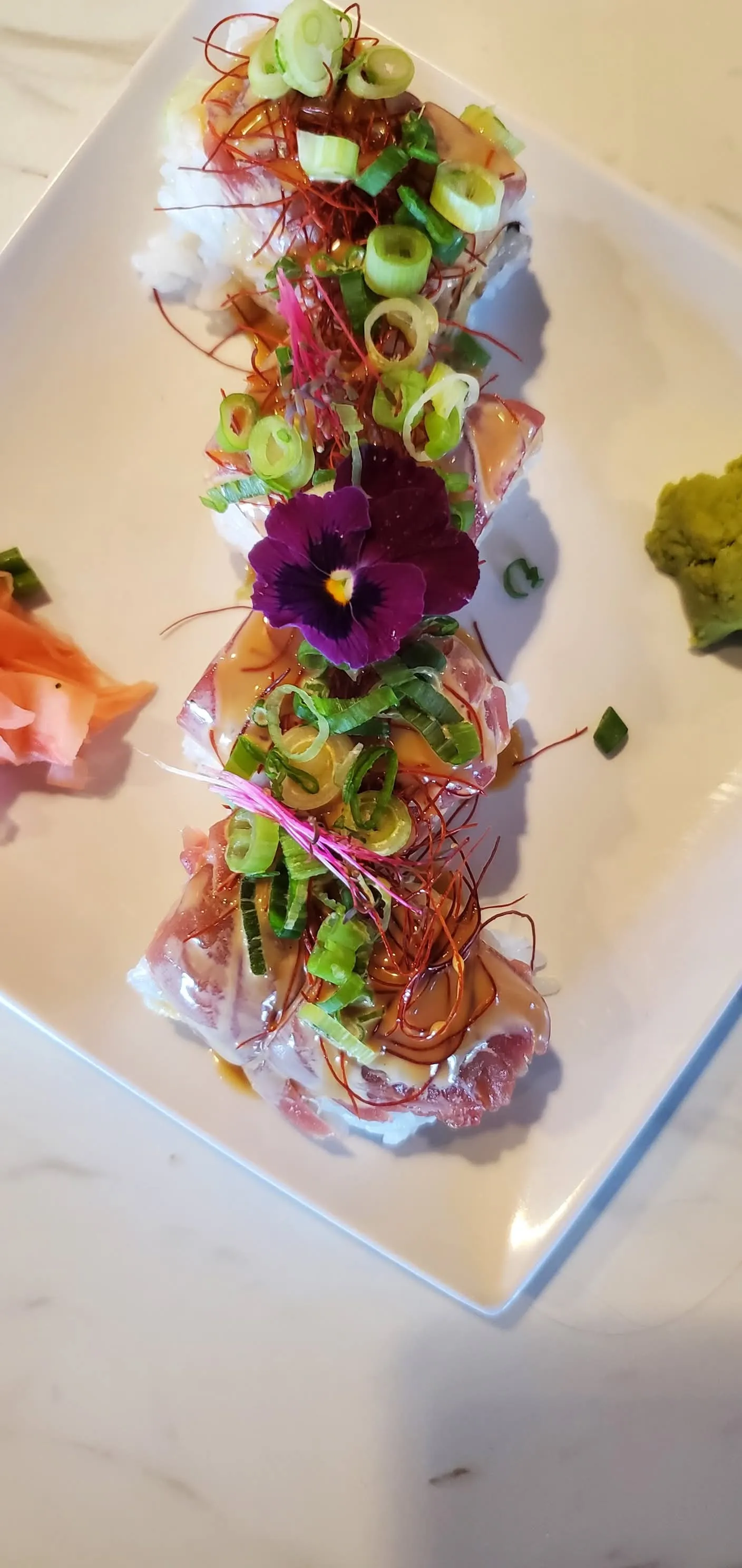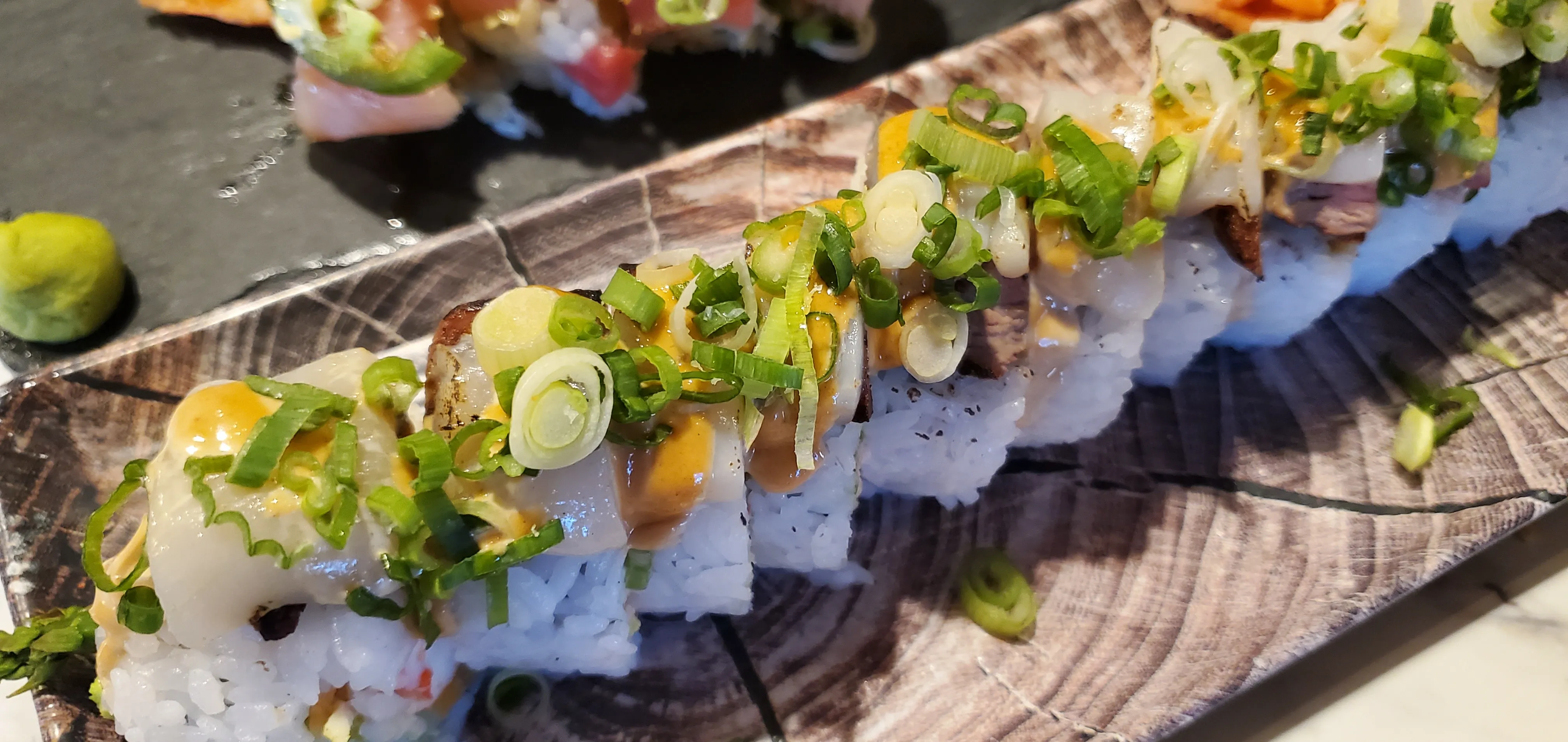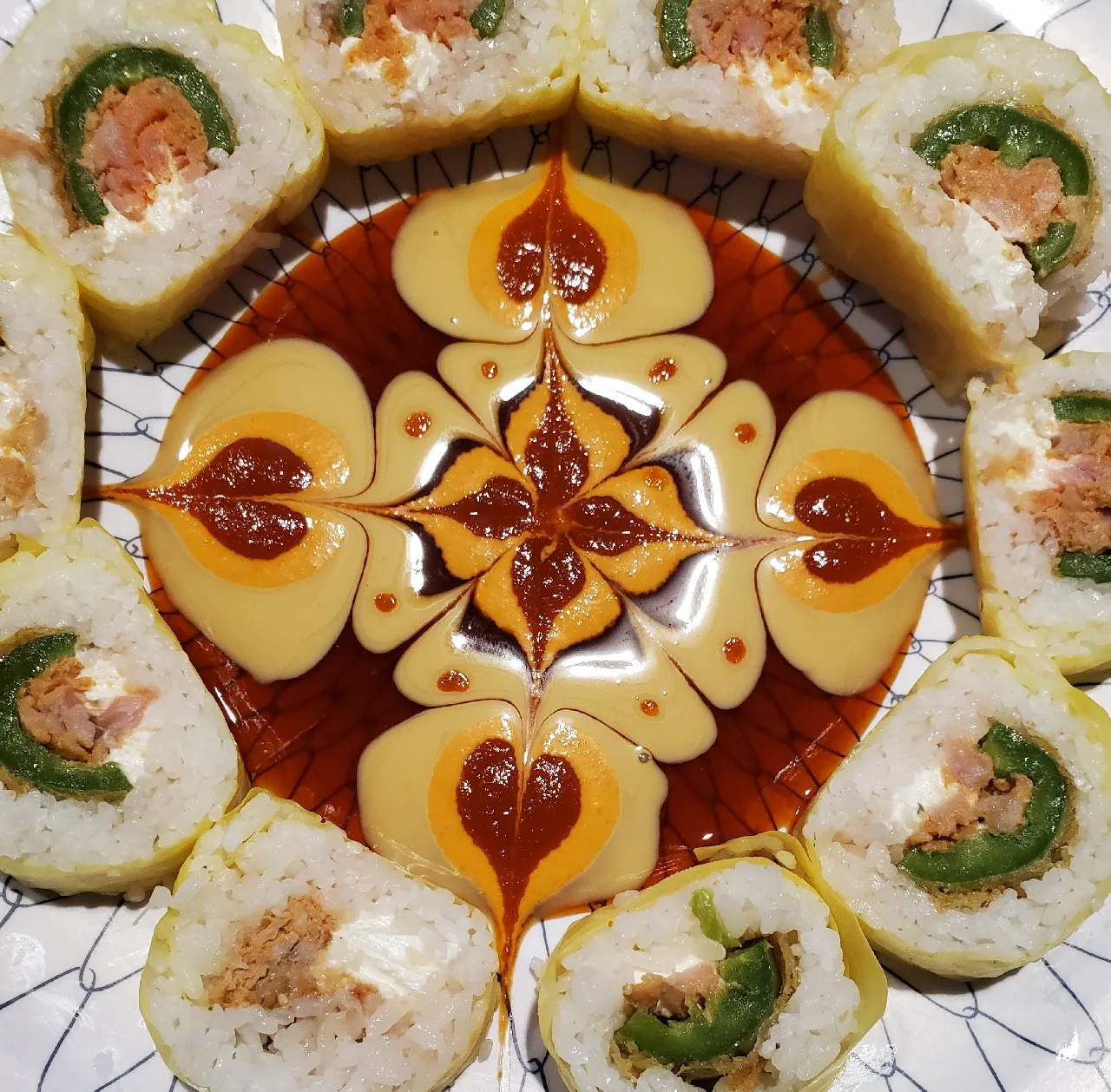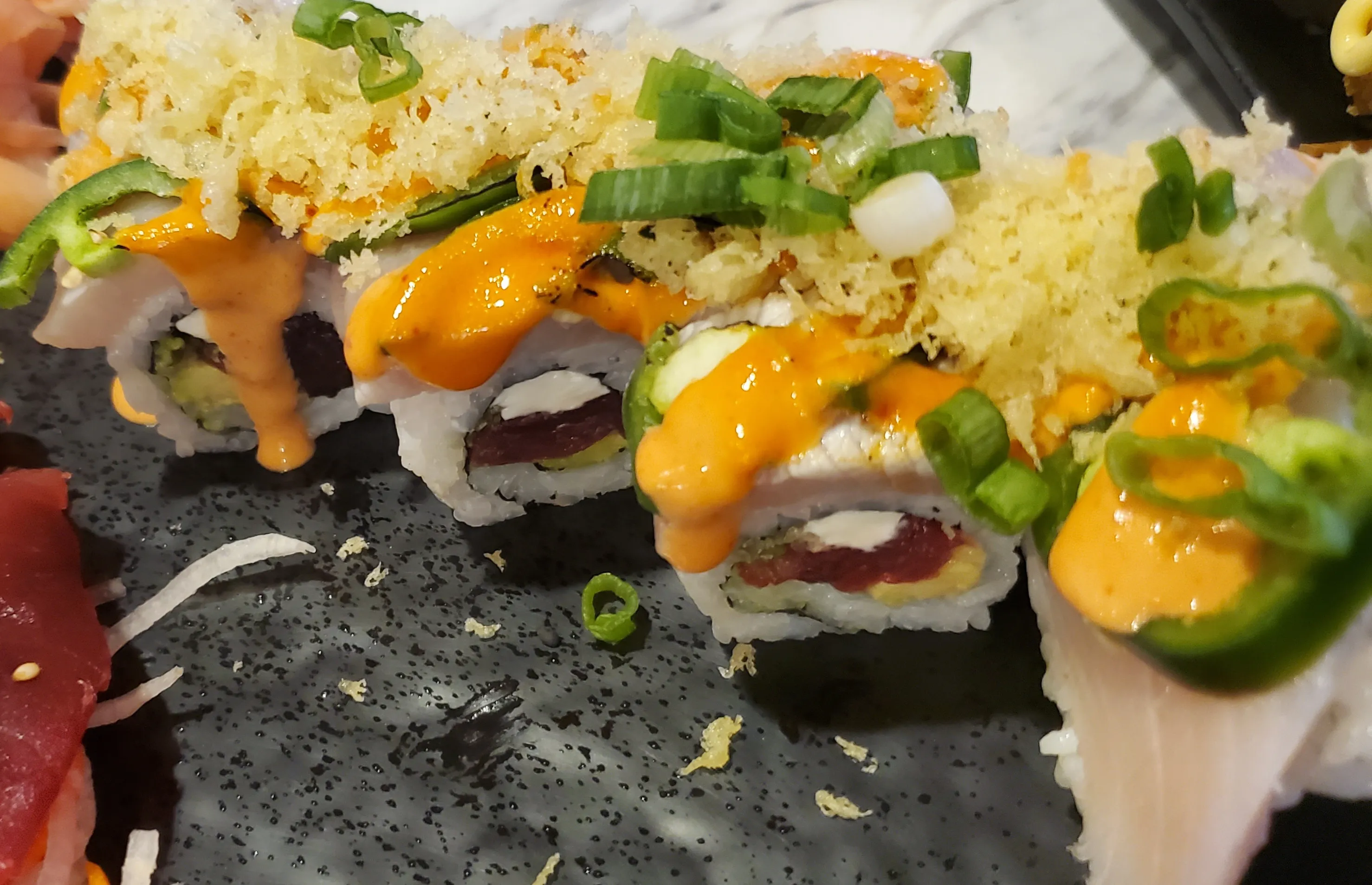 Salmon, Jalapeno, Tempura Asparagus, Cucumber, And Cream Cheese Topped With Tuna And Avocado And Finished With Dragon Sauce, Ito Togarashi, Shoyu Tobiko, And Green Onions