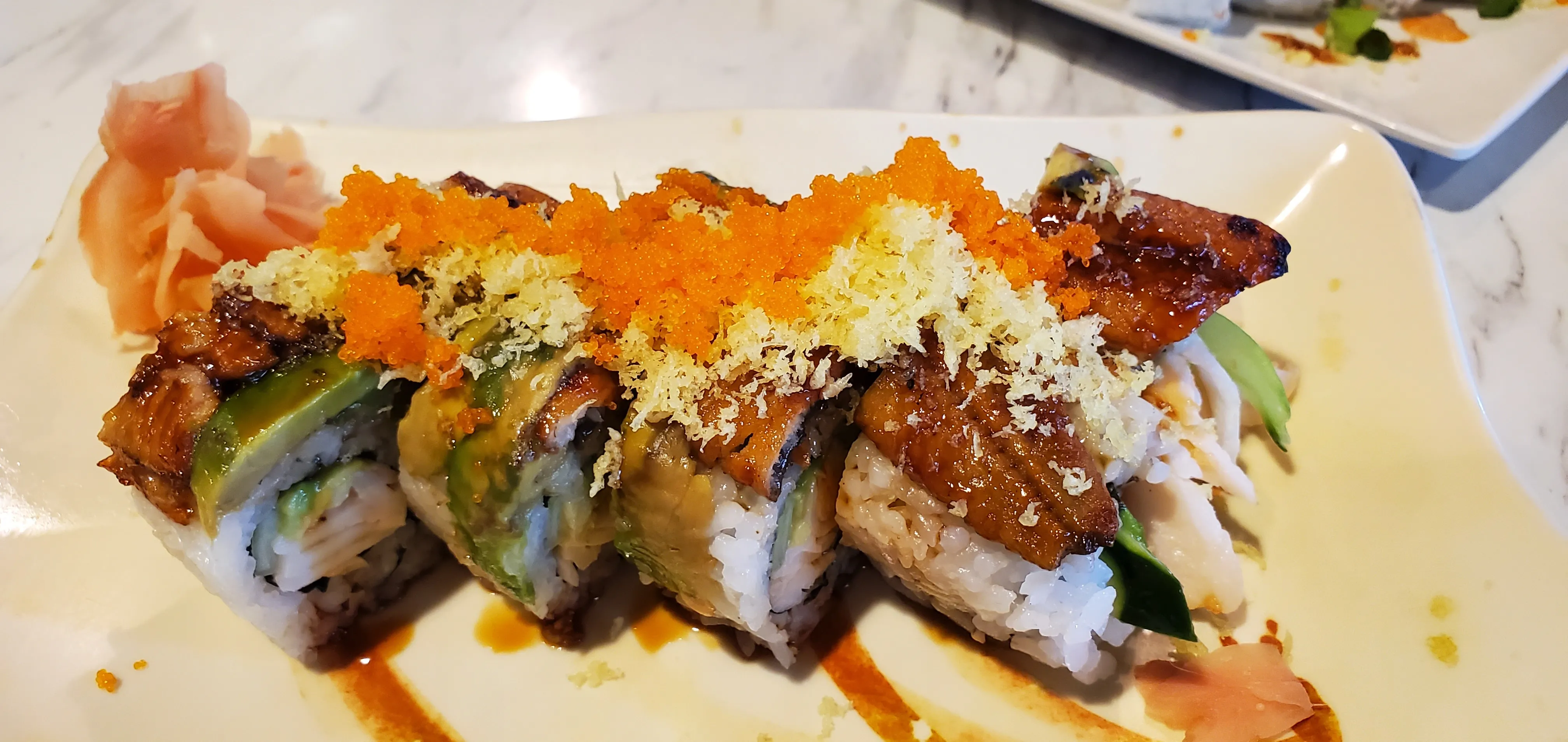 California Roll Topped With Fresh Water Eel, Avocado, Teriyaki, Crunchies & Masago.