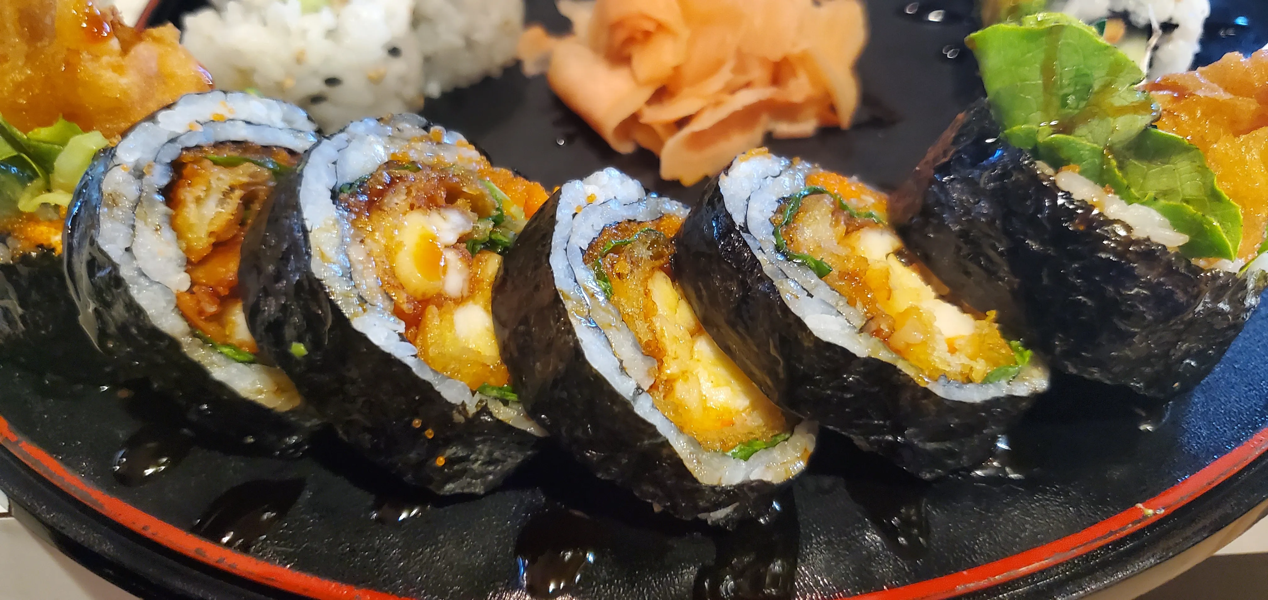 Yellowtail, Tempura Shrimp, Krab Mix, Cucumber & Jalapenos, Topped With Salmon & Avocado, Seared With Spicy Crack Sauce & Finished With Crunchies & Sprouts.