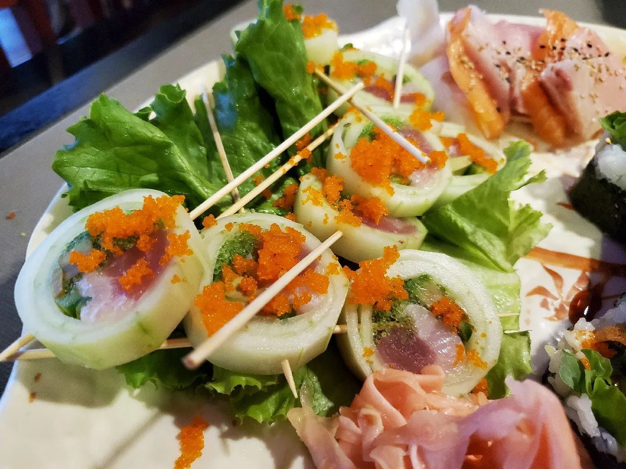 Tuna, Yellowtail, Avocado, Jalapenos & Wasabi Tobiko In A Cucumber Wrap. Finished With Masago & Green Onions & Served With Ponzu Sauce. No Rice On This Roll