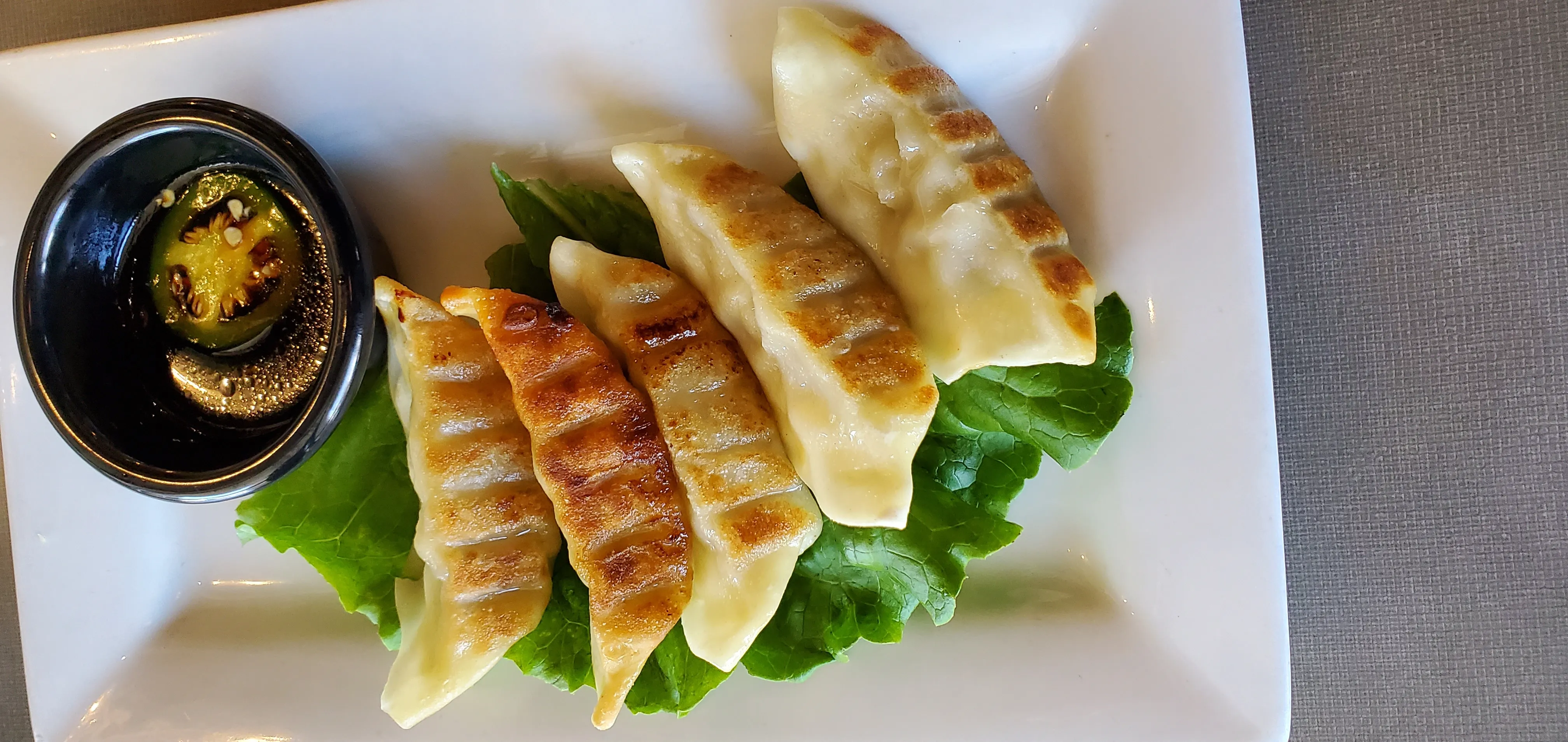 5 Shrimp Dumplings Served With Tonkatsu Sauce.